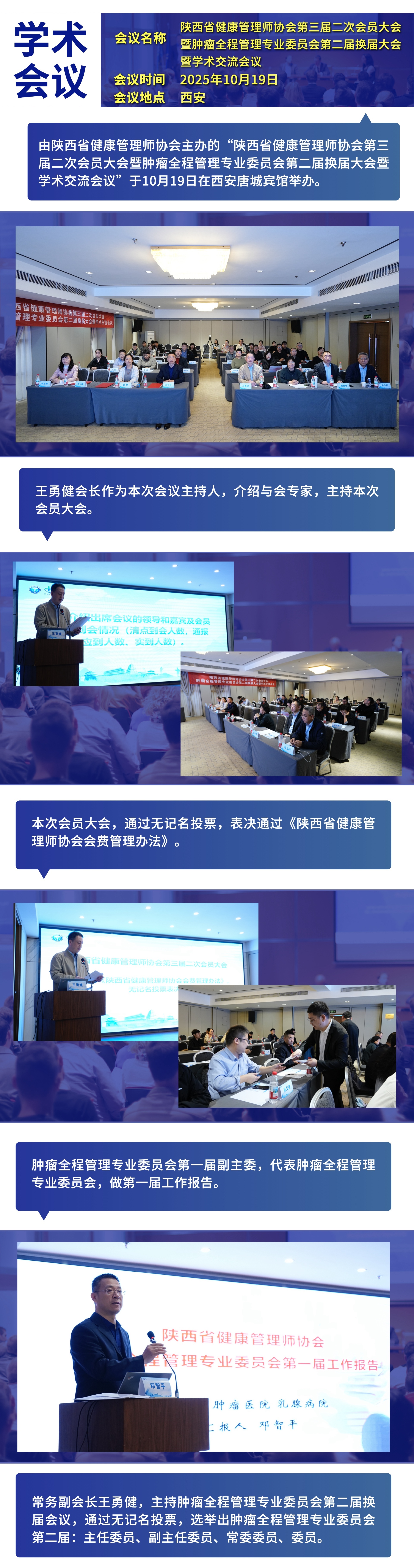 大会审议并通过了:赵曾副会长作的《陕西省健康管理师协会第二届理事会工作报告》及陕西省健康管理师协会第二届理事会会长王勇健作的《陕西省健康管理师协会第二届理事会财务审计报告》、《陕西省健康管理师协会章程(草案)》等。