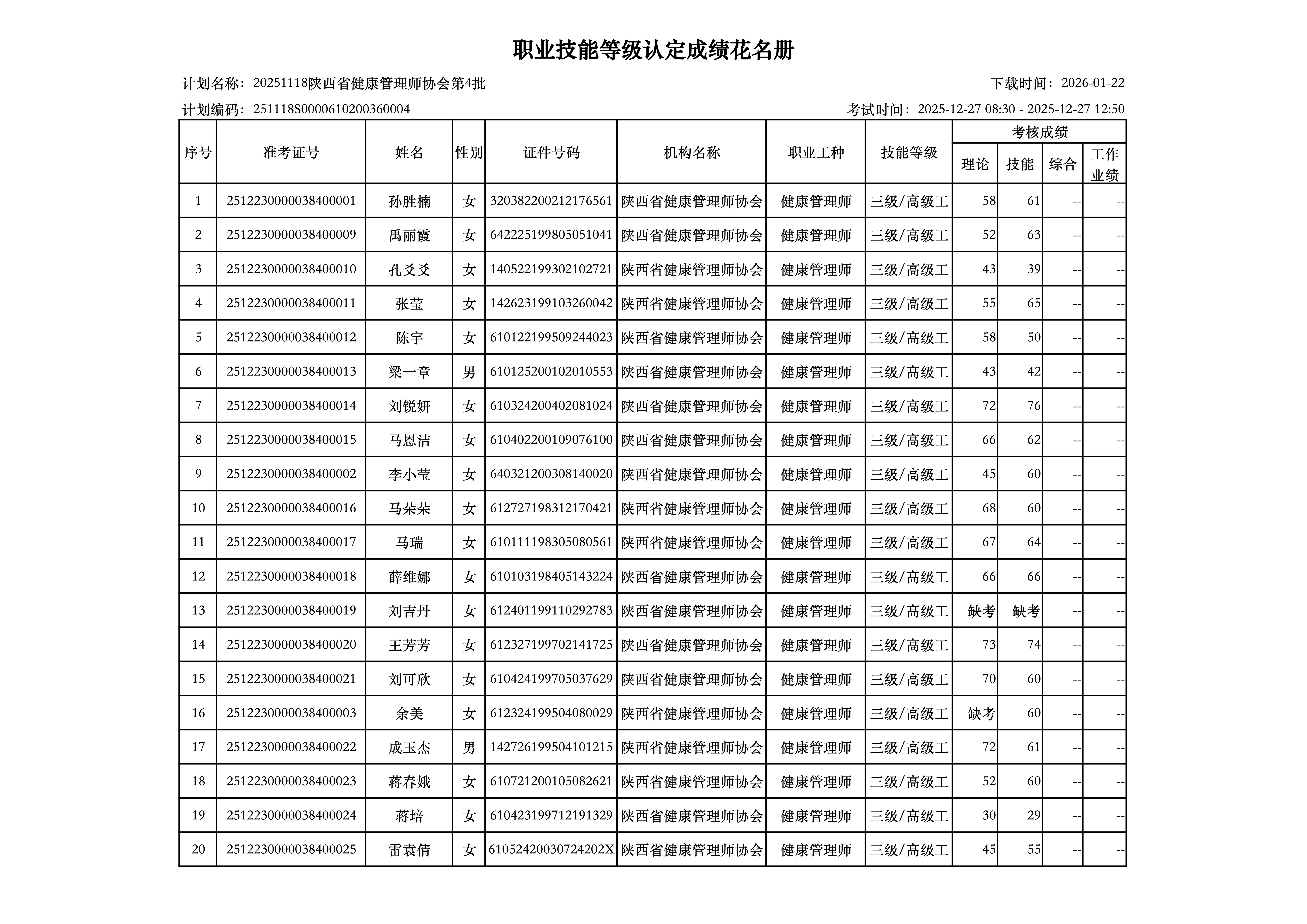 20251118陕西省健康管理师协会第4批健康管理师成绩公示,公示时间为2026年1月22日-2026年1月26日。公示期间,如有异议,可向陕西省健康管理师协会职业技能等级认定中心反馈。监督电话:029-85226420。